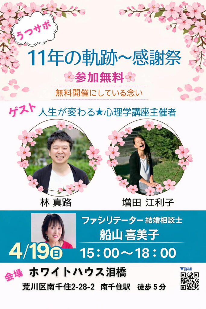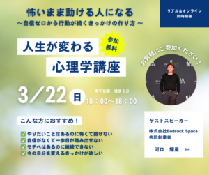今月のスピーカーさん →イベントの詳細はこちらから 来月以降のスピーカーさん 5月 日時:5月17日(日) 15:00~18:00ゲストスピーカー:谷 久子 さん埼玉県川口市精神障害者の家族会 会長子どもと関わるのが大好きで、小学校教員、障がい児補助、児童館職員、学童保育支援員などを40年以上務める。 不登校·ひきこもりの生徒と関わり、親の会、全国集会、専門家、NPO法人ひきこもり支援団体他から学び、相談も受ける。不登校で発達障害の息子の親としての経験から「経験しているから分かってもらえる」と喜ばれたことをきっかけに『もっと多くの人に喜んでもらいたい』と思い、カウンセラーの資格を取り活動。 6月 日時:6月7日(日) 15:00~18:00ゲストスピーカー:田中 孝太郎 さん株式会社TKC 代表取締役天才キッズクラブ 理事長神奈川県を中心に、すべての子どもたちが天から授かった才能・個性を最大限引き出せる環境を整えた保育園「天才キッズクラブ」を運営。1月に続いて再度登壇して頂くこととなりました。今回は天才キッズクラブ名物のカルタで「カルタ大会」を開催したいと思います! 先月のスピーカーさん →イベントの詳細はこちらから SNS インスタグラム Instagram→こちらからTikTok→こちらから 2025~2026年 2026年3月 河口 耀星 さん 人生を変える☆心理学...Read More 2026年2月 杉原 海 さん 人生を変える☆心理学...Read More 2026年1月 田中 孝太郎 さん 人生が変わる☆心理学...Read More Load More お問合せ・お申込みはコチラ